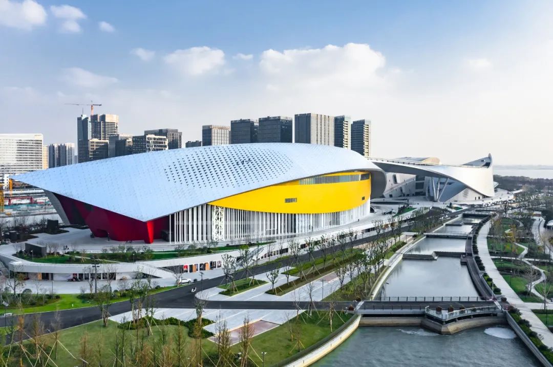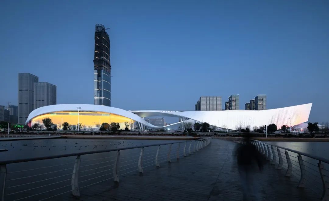 臨太湖而建的蘇州灣文化中心用地面積160畝,總建筑面積約22萬(wàn)平方米。沿著(zhù)城市軸線(xiàn)分布南北兩個(gè)片區,北側包括一個(gè)可容納1600座的大劇院、一個(gè)可容納600座的戲劇廳,10余間排練廳、IMAX影城和湖景餐廳;南側包括吳江博物館,規劃展示館,會(huì )議中心。兩者通過(guò)飄逸的雙曲絲帶造型鋼結構巨型天幕連通,最終融入同一座宏大建筑體中。獨具一格的建筑造型與公共空間樹(shù)立了湖區時(shí)代的文藝新典范,開(kāi)業(yè)后迅速成為了蘇州乃至周邊地區的網(wǎng)紅打卡地和蘇州城市文化的新名片
